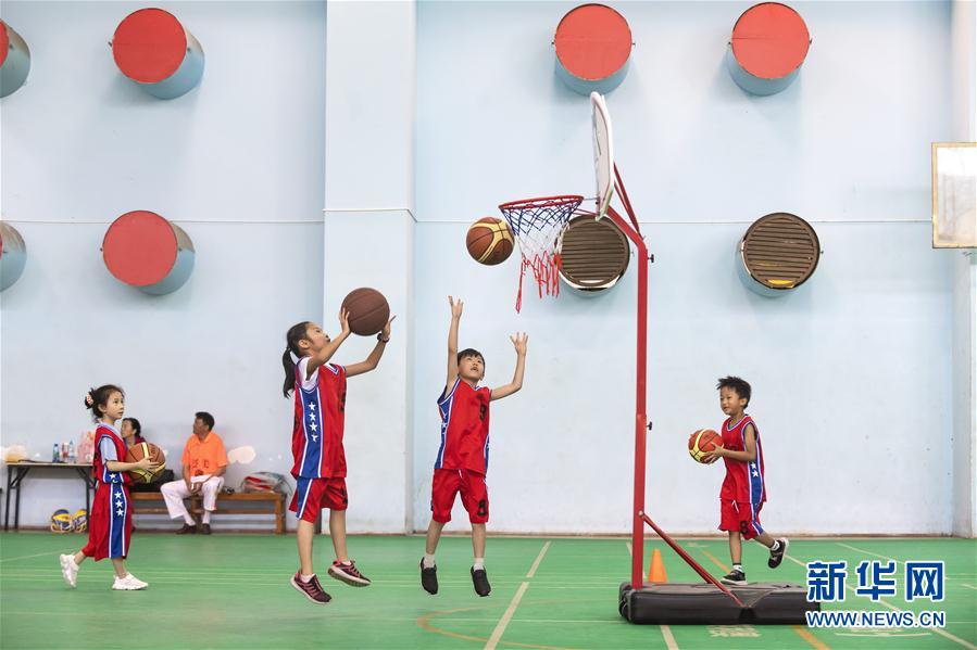 8月4日,在昆明市体育馆内,篮球培训班学员们在练习投篮。 暑假期间,昆明市青少年体育俱乐部在做好防疫、确保安全和健康的前提下开办了篮球、羽毛球、空手道、跆拳道等项目培训班,孩子们通过参加体育培训班的方式丰富暑期生活,培养对体育的兴趣,增强体质。 新华社发(陈欣波摄)