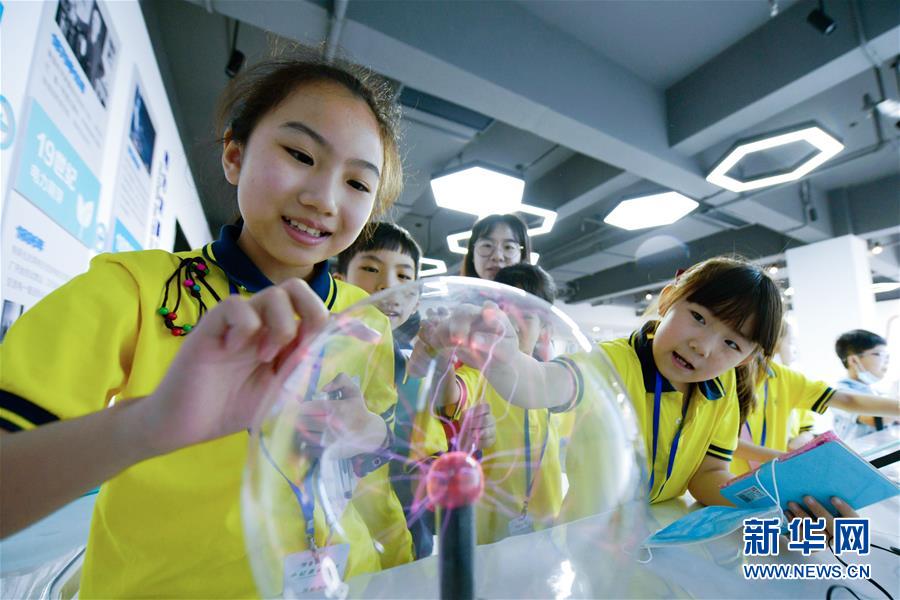 8月14日,在余姚新时代文明实践基地内的科普中心,小朋友触摸离子球。新华社记者 徐昱 摄