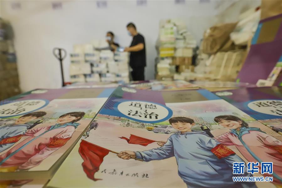 8月18日,河北唐山新华书店遵化分公司的工作人员在整理新学期教材。 开学将近,各地做好新教材的调运、整理和发送工作,确保开学时新书及时发放到学生手中。 新华社发(刘满仓 摄)
