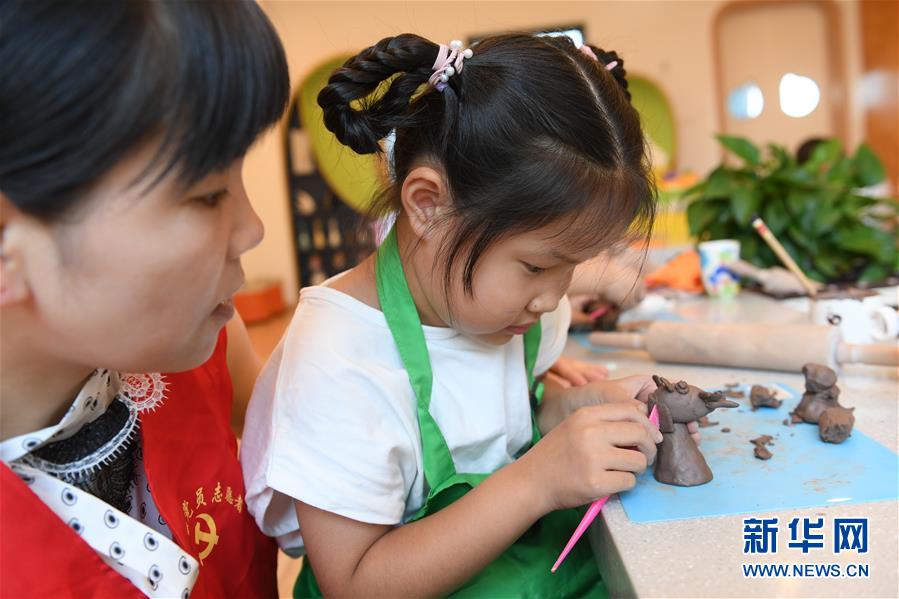 8月19日,新登镇党员志愿者带着小朋友进行陶艺创作。 当日,浙江杭州富阳区新登镇第二幼儿园大山园区开展“五彩陶艺”暑期活动,幼师、党员志愿者指导小朋友进行陶艺创作。该校自2015年起开始将陶艺作为特色课程,锻炼学生的动手能力。 新华社记者翁忻旸摄