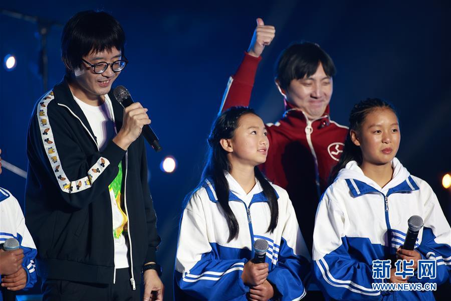 “未知少年”乐队成员晏兴雨(左二)和熊秋花(右一)在“海嘎少年的夏天”音乐会上与新裤子乐队成员一起演出(8月19日摄)。 新华社记者 刘续 摄