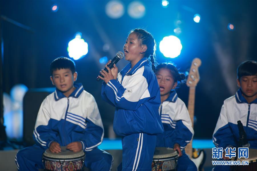 海嘎小学学生熊会(左二)在“海嘎少年的夏天”音乐会上演唱(8月19日摄)。 新华社记者 刘续 摄