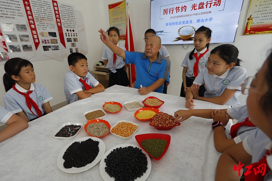 2020年8月19日,山东威海市杏花村社区活动室,孩子们正在学习辨识各种粮食。当日威海市杏花村社区联合南山小学开展“珍惜粮食,拒绝浪费”主题活动,孩子们和社区工作人员一起观看珍惜粮食的教育警示视频,听老兵爷爷讲述战争年代节粮故事,朗诵《悯农》古诗,一起体会粮食来之不易的道理,让孩子从小树立节约粮食 拒绝浪费的意识,争做节粮爱粮小先锋。图片来源:视觉中国