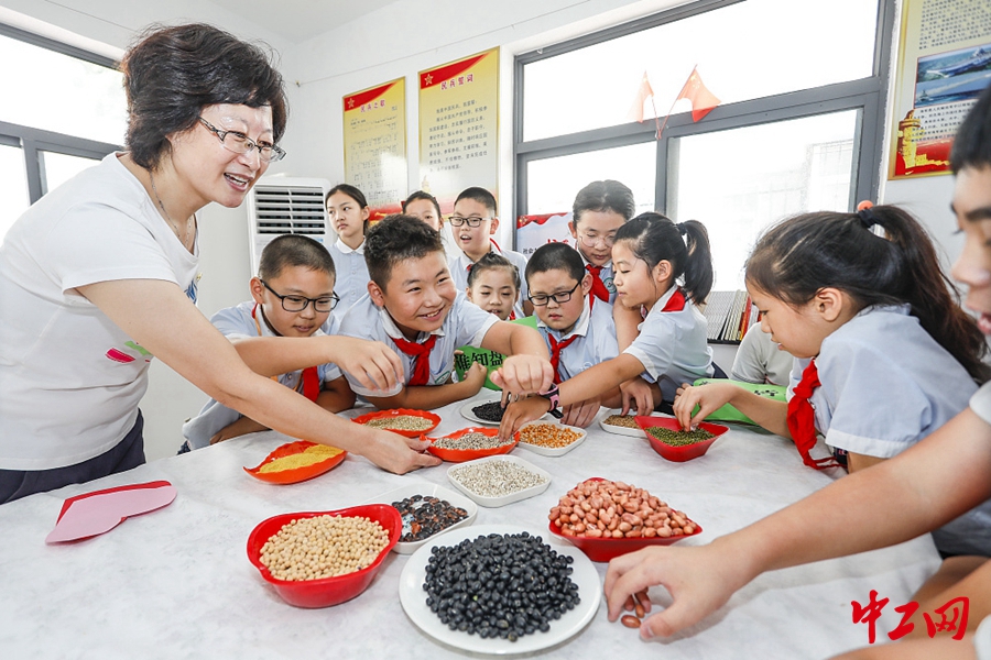 2020年8月19日,山东威海市杏花村社区活动室,孩子们正在学习辨识各种粮食