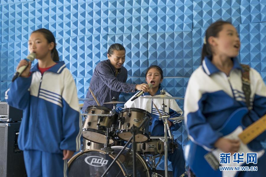 “痛仰”乐队成员走进贵州省六盘水市钟山区大湾镇海嘎村海嘎小学与孩子们一起唱歌(7月25日摄)。 新华社发