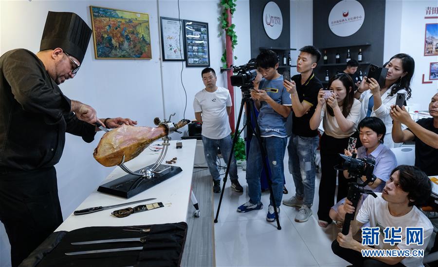 8月25日,西班牙的专业导师示范如何进行火腿切片。