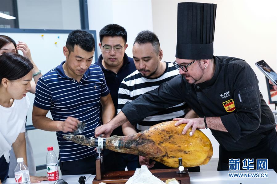 8月25日,西班牙的专业导师在教授学员火腿切片的步骤。 新华社记者 徐昱 摄