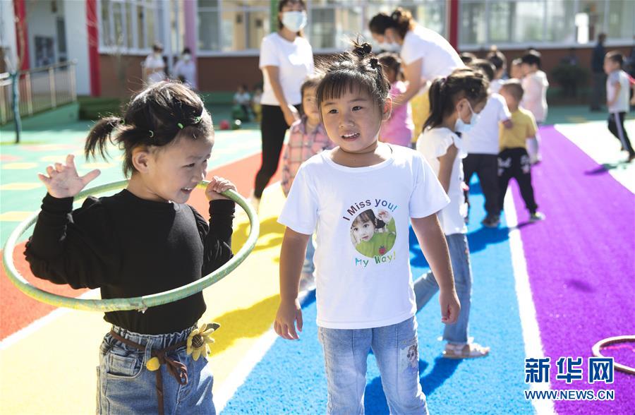 8月25日,在新落成的灵口镇中心幼儿园里,即将入园的孩子们在做游戏。 当日,新落成的陕西省洛南县灵口镇中心小学教学楼和灵口镇中心幼儿园邀请即将开学的孩子们参观、体验新的教学环境。灵口镇中心小学原有16个教学班,其中超过55人的大班13个。新落成的教学楼增加了15个教学班,新增600个学位,不仅可改善昔日教室拥挤现象,也可解决搬迁户子女入学难问题。 新华社记者陶明摄