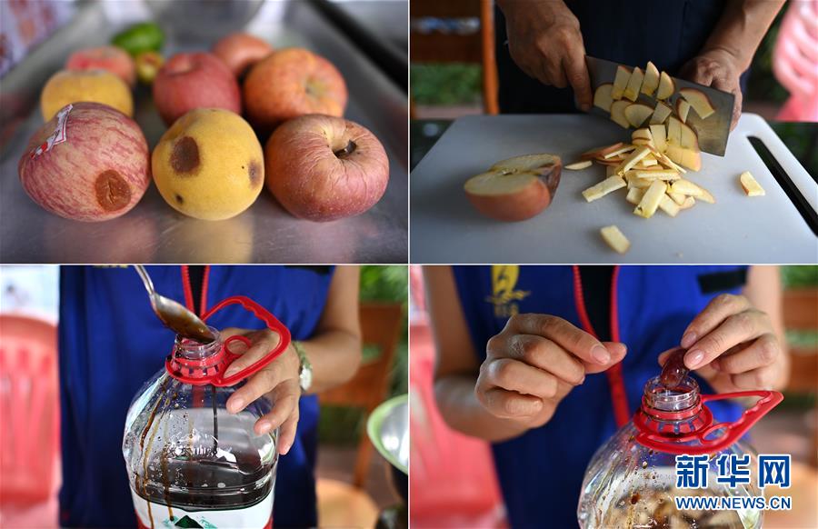 8月25日,海口市美兰区白沙门环保教育站的志愿者用瓜果类厨余垃圾制作环保酵素(拼版照片)。 海南省海口市美兰区为动员居民群众参与垃圾分类、践行环保生态理念,在各街道、社区建立了多个环保教育站和环保屋,寓教于乐教会人们垃圾分类,吸引了很多志愿者和周边居民参与其中,成为海口市垃圾分类的“网红阵地”。 根据《海南省生活垃圾分类工作实施方案》,海南省海口市、三亚市、三沙市、儋州市自2020年10月1日起全面实施生活垃圾分类,到2022年基本建成生活垃圾分类处理系统。 新华社记者郭程摄