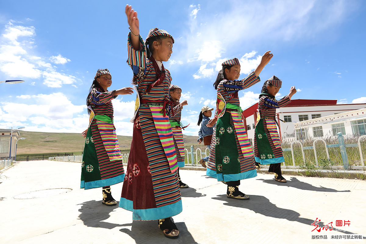 赤列措姆和小伙伴们平时除了上汉语、藏语、英语、数学课,她还会和同学一起在操场上唱歌跳舞。(李刚摄/光明图片)