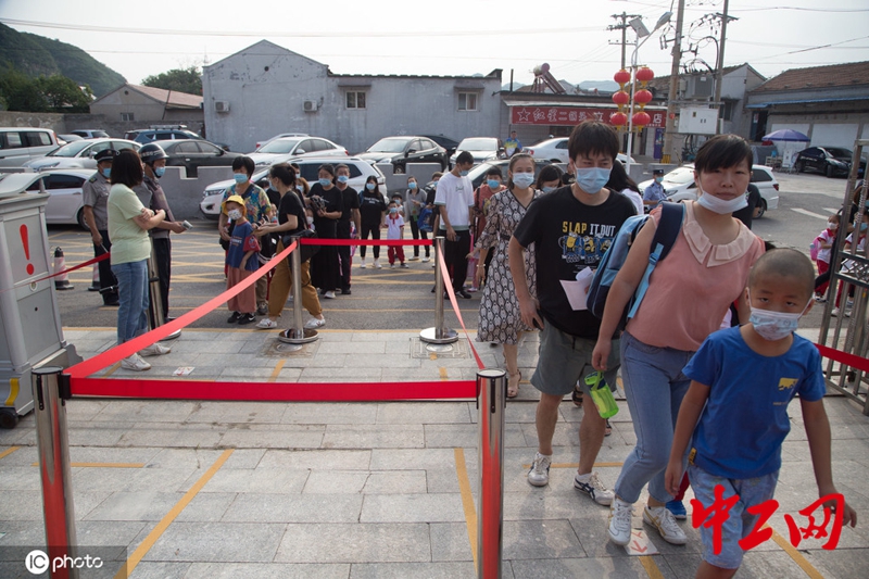 2020年8月29日,北京市门头沟区妙峰山民族学校一年级的学生在家长的带领下测体温后进入校门。侯继庆/IC photo