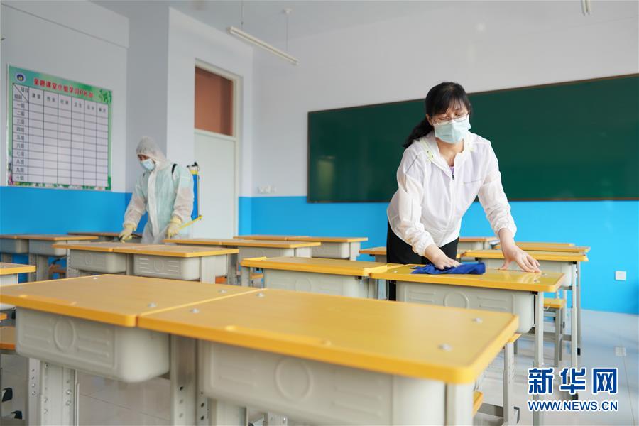 8月29日,河北省内丘县新西关小学工作人员对教室进行消杀和清洁。 开学在即,河北省内丘县各级学校组织教职员工对教学楼、食堂、宿舍等区域进行全面清洁消毒,完善各项防疫措施,保障学生学习环境和生活环境的卫生安全。 新华社记者 牟宇 摄