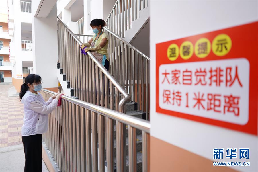 8月29日,河北省内丘县新西关小学工作人员对教学楼进行清洁。 开学在即,河北省内丘县各级学校组织教职员工对教学楼、食堂、宿舍等区域进行全面清洁消毒,完善各项防疫措施,保障学生学习环境和生活环境的卫生安全。 新华社记者 牟宇 摄