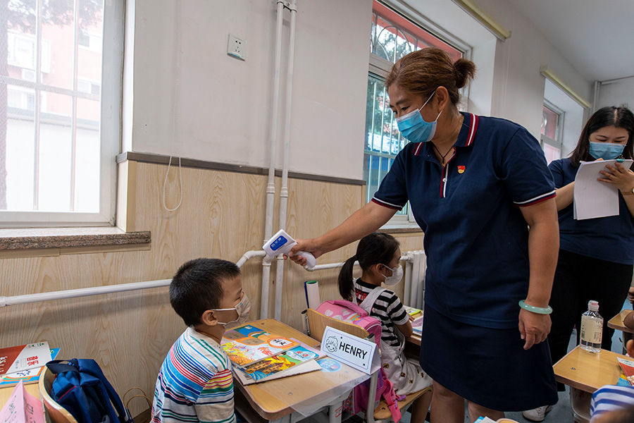 受新冠肺炎疫情影响,今年北京市中小学、幼儿园实行分批、错峰开学。8月29日,北京市中小学开学季启动,小学一年级,初一年级、初三年级,高中三个年级率先开学,约59万学生校园报到,其中约有20.5万是小学一年级新生。据悉,多数学校安排了新生入学教育、开学典礼、开学第一课等主题活动,帮助学生度过从居家生活到校园学习的适应阶段。(人民网记者 翁奇羽 摄影报道)