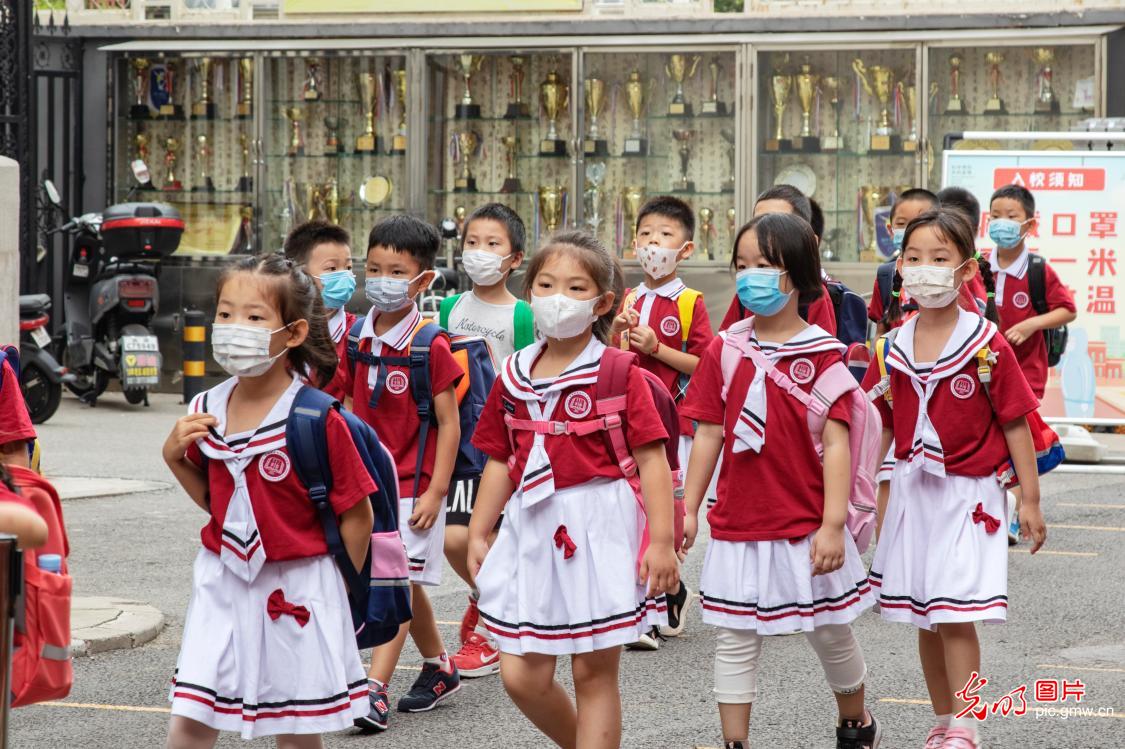 2020年8月30日,北京市所属小学正常开学,东城和平里九小一年级新生入学。今年该校一年级招生10个班近400人。正式上课前专门组织一年级新生进行入学"预演"。(黄重金摄/光明图片)
