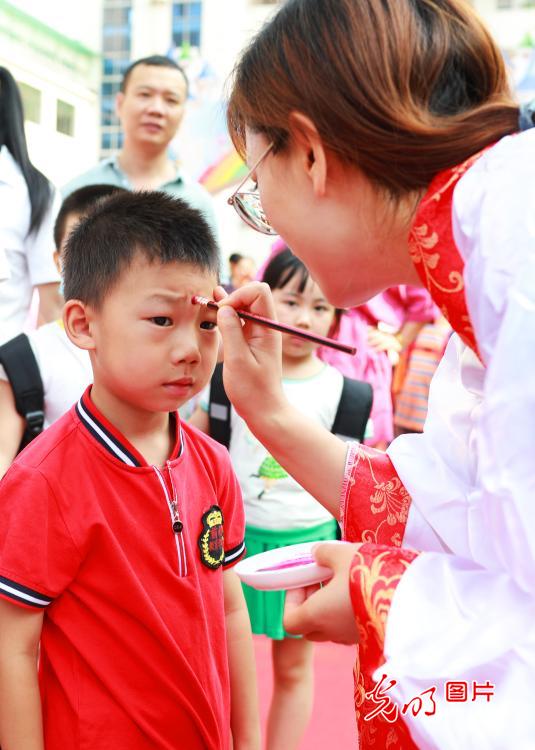 2020年8月30日,湖南省郴州市第一完全小学迎来开学日,400余名一年级新生在家长的带领下雀跃入校,穿过“启智门”,接受“朱砂启痣”,在浓厚的中华传统文化中,喜迎新学期到来。(邓美丽摄/光明图片)