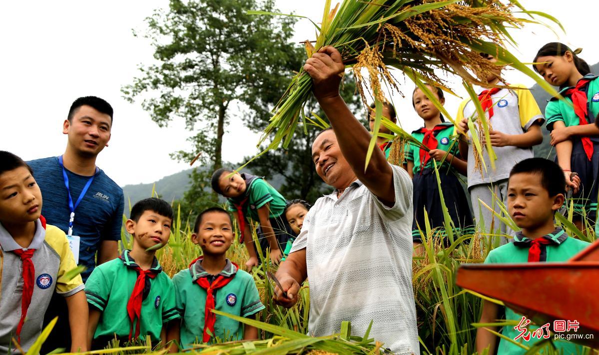 2020年8月31日,四川省泸州市纳溪区太山实验学校五年级一班的孩子们,来到合面镇太山村的稻田里上"开学第一课",老师和当地村民给孩子们讲述水稻的生长过程,教孩子们如何收割水稻,体验"谁知盘中餐,粒粒皆辛苦"的艰辛。(廖胜春摄/光明图片)