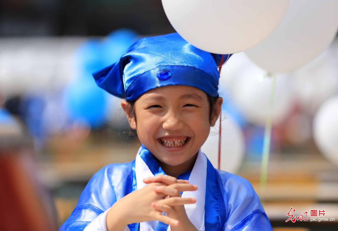 8月31日,广西柳州市融安县实验小学举行的"开笔礼"仪式上,一年级新生身着传统汉服露出各种"萌"表情。(谭凯兴摄/光明图片)