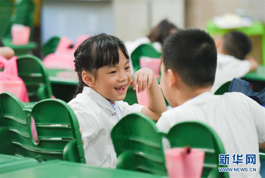 9月1日,在福州教育学院附属第四小学,一年级新生在做自我介绍,相互认识。 当日,福建省福州市中小学全面开学。 新华社记者 宋为伟 摄