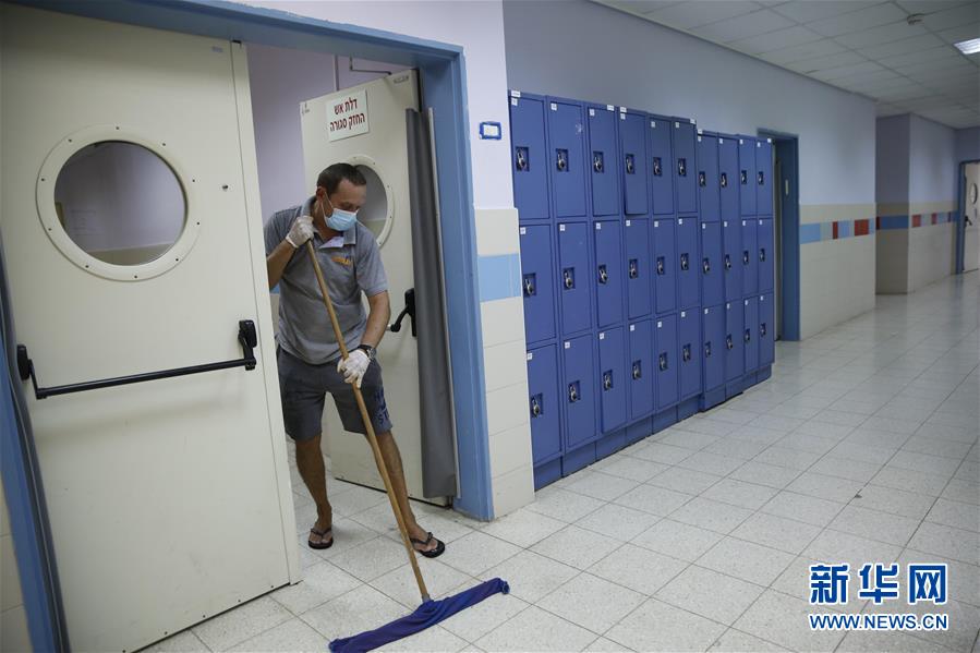 8月31日,一名清洁人员在以色列中部城市莫迪因一所学校打扫地面。 根据以色列教育部和卫生部的安排,新学年于9月1日开始,低年级(1至4年级)进行小班教学,中高年级(5至12年级)则主要是远程在线学习。 新华社发(吉尔·科恩·马根摄)