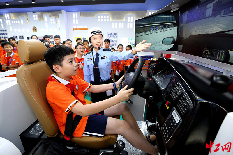 9月1日,在山东省枣庄市公安局峄城分局交通警察大队文明交通实践中心,一名小学生在交警的帮助下体验驾驶动感模拟机。