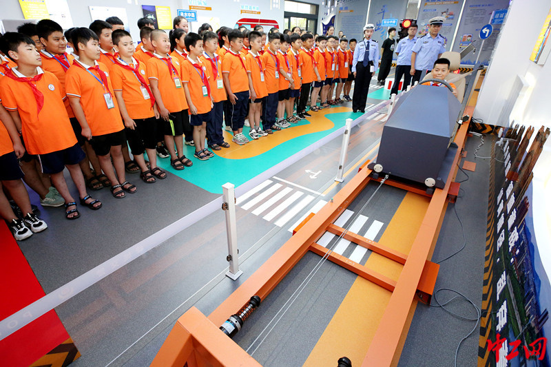 9月1日,在山东省枣庄市公安局峄城分局交通警察大队文明交通实践中心,一名小学生在体验碰撞机。