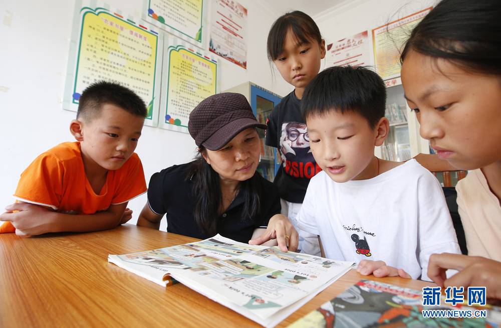 9月5日,胡海青与留守儿童一同阅读课外读物。