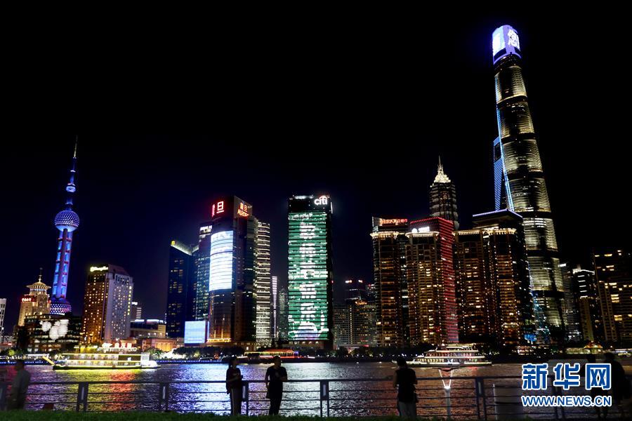9月8日晚,上海“外滩之窗”大屏和上海中心塔冠点亮“为教师亮灯”活动主题灯光。 新华社记者 刘颖 摄
