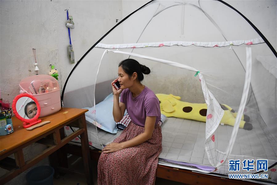 在广东徐闻县北莉小学,林小恋在学校宿舍给家人打电话。宿舍条件艰苦,只靠一台风扇来降温(9月1日摄)。新华社记者邓华 摄