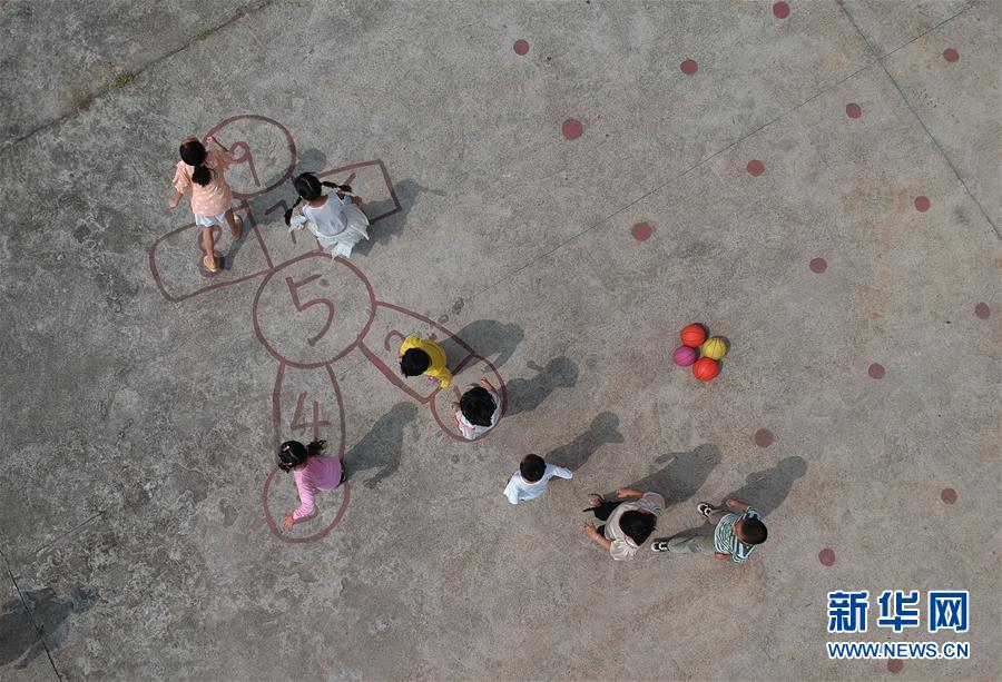 9月9日,荷泉小学的孩子们课间在操场上玩游戏(无人机照片)。 新华社记者 赵众志 摄