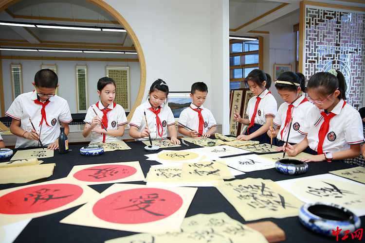2020年9月9日,在第36个教师节即将来临之际,浙江省东阳市实验小学书法培优团的学生写书法来表达对老师的感恩之情。胡扬辉/视觉中国