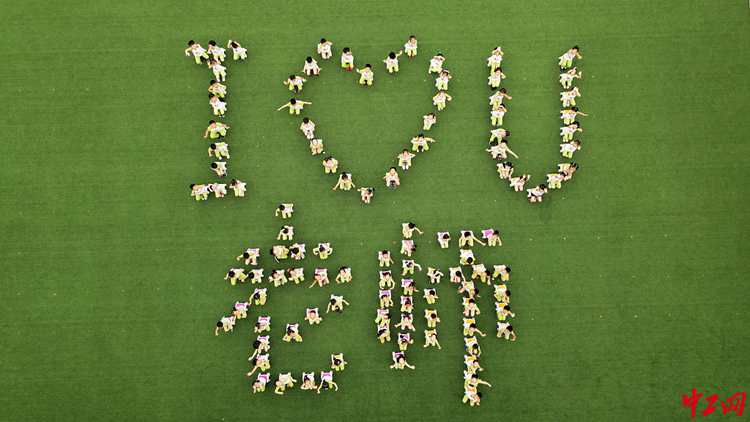 2020年9月10日,江苏扬州,扬州大学附属西郡幼儿园的小朋友在操场拼出意为“我爱你,老师”的汉字和字母。孟德龙/视觉中国