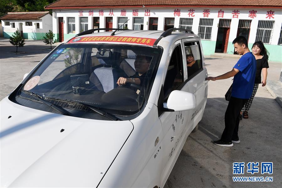 9月3日,在秦安县陇城教育园区赵山教学点,“走教”老师付耀峰(右二)、王昕(右一)准备乘坐教师校车返回园区公寓。新华社记者 范培珅 摄