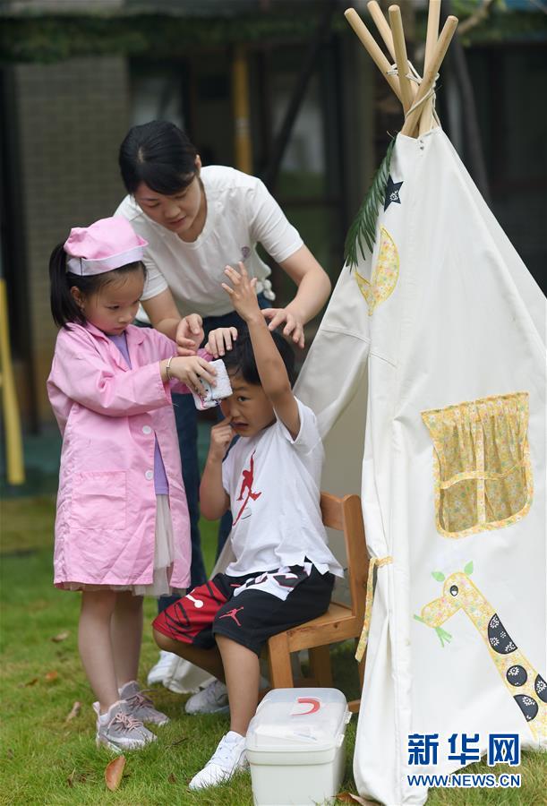 9月11日,浙江省诸暨市城西幼儿园的孩子们在“世界急救日”主题教育活动上进行野外受伤处理情景式演练。 每年9月的第二个星期六为“世界急救日”,各地学校纷纷开展急救日主题教育活动,组织学生们进行日常救护学习、防灾避险演练等,提高他们的自救互救意识和能力。 新华社记者 韩传号 摄