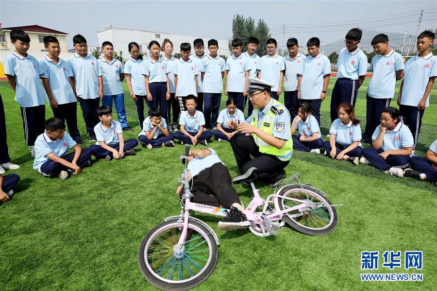 9月11日,山东省枣庄市公安局峄城分局交通警察大队的交警在荀子学校向学生讲解交通事故中的自救和互救知识。 每年9月的第二个星期六为“世界急救日”,各地学校纷纷开展急救日主题教育活动,组织学生们进行日常救护学习、防灾避险演练等,提高他们的自救互救意识和能力。 新华社发(孙中喆 摄)