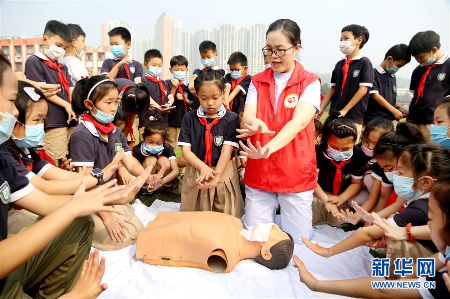 9月11日,连云港市市立东方医院的医护人员在连云港市院前小学的“急救知识进校园”主题活动上向学生们传授心肺复苏急救技能。 每年9月的第二个星期六为“世界急救日”,各地学校纷纷开展急救日主题教育活动,组织学生们进行日常救护学习、防灾避险演练等,提高他们的自救互救意识和能力。 新华社发(王春 摄)