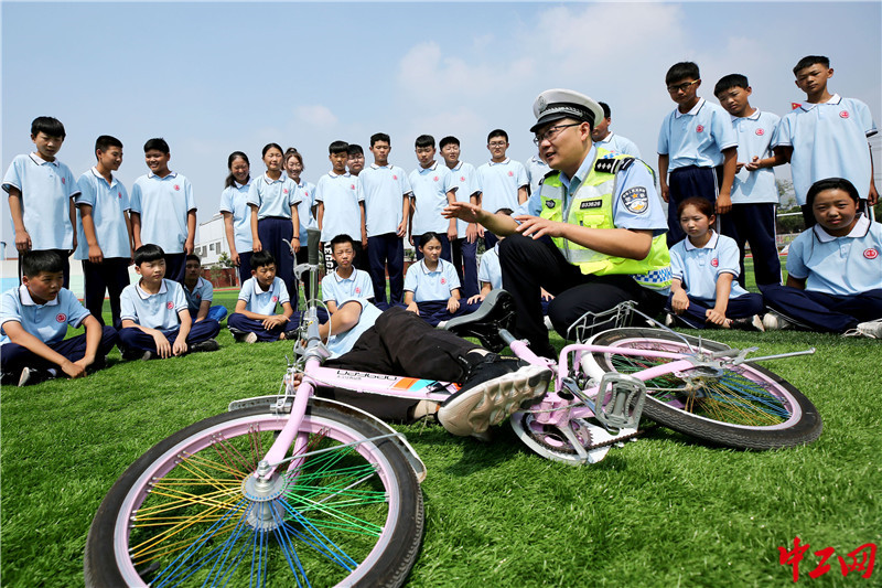 9月11日,山东省枣庄市公安局峄城分局交通警察大队的交警在荀子学校向学生模拟传授疫情下如何自救和互救知识。
