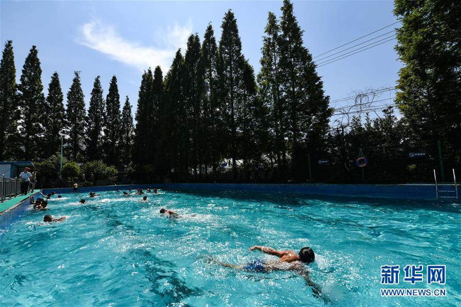 图为越西县西城中学初三16班的学生在室外泳池上游泳课(9月7日摄)。 新华社记者王曦摄