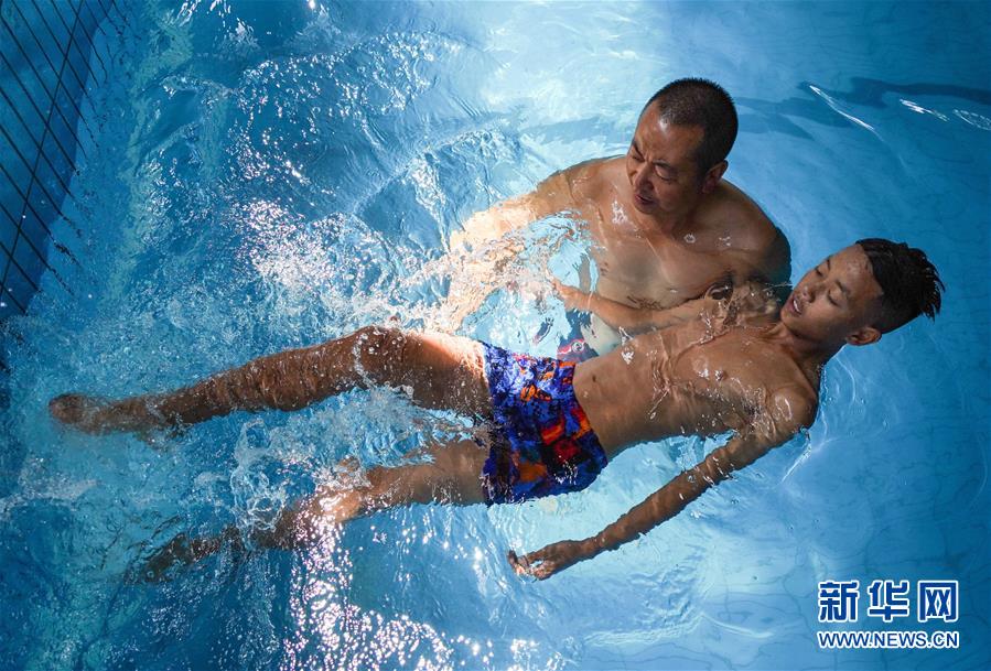 图为体育教师李斌如(上)帮助学生练习仰泳(9月7日摄)。 新华社记者王曦摄