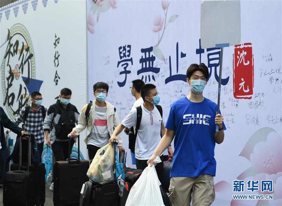 9月14日,在北京航空航天大学校园内, 迎新志愿者(右一)带领2020级本科新生前去报到。 当日,北京航空航天大学迎来2020级本科新生。北京航空航天大学2020年共录取本科新生3843人。 新华社记者 鞠焕宗 摄