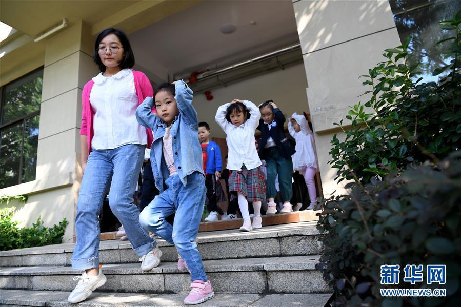 9月18日,合肥市六安路小学翠微分校的学生在进行疏散演练。 当日,安徽省合肥市经开区在合肥市六安路小学翠微分校开展防空疏散演练活动,提高学生的防空防灾意识和自救互救能力。 新华社记者 刘军喜 摄