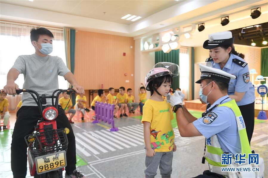 9月18日,在福建幼儿师范高等专科学校附属第一幼儿园,民警为小朋友戴上安全头盔。 国庆黄金周到来前,福建福州交警与多所中小学、幼儿园开展“交通安全伴我成长”主题活动,让学生们通过互动游戏了解交通安全出行常识。 新华社记者 宋为伟 摄