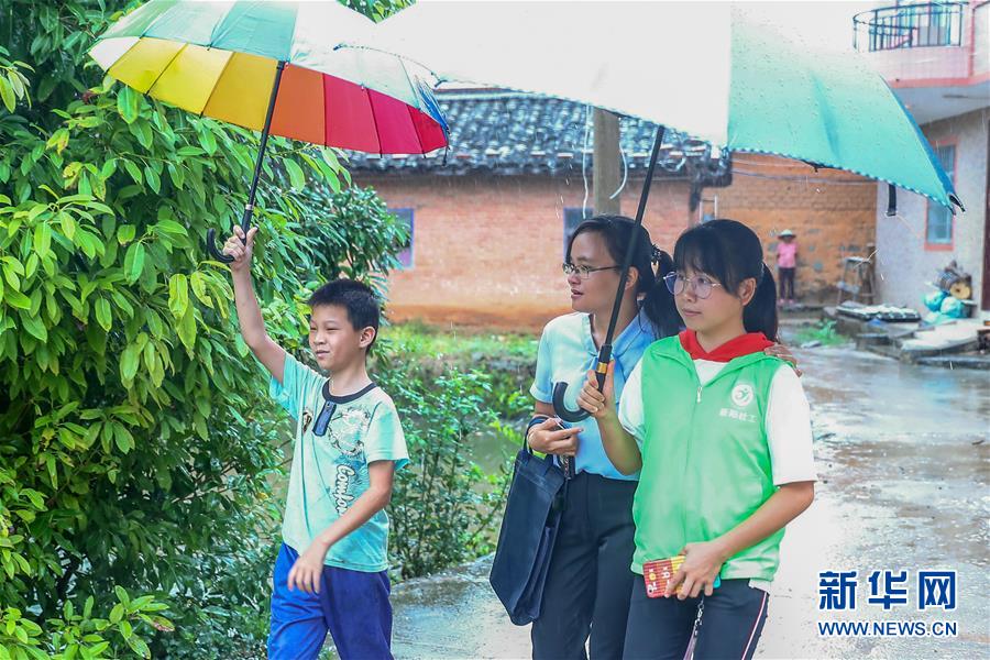 9月20日,儿童主任黄飞凤(中)与社工(右)在灵山县佛子镇元眼村陪伴一名孩子前往“儿童之家”。 新华社记者 张玉薇 摄