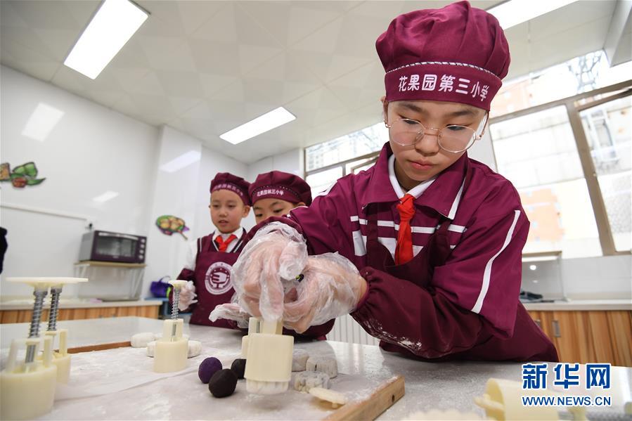 9月24日,贵阳市南明区花果园第三小学的学生制作冰皮月饼。 当日,贵州省贵阳市南明区花果园第三小学开展“体验月饼制作 弘扬传统文化”活动,同学们在老师的指导下制作冰皮月饼,感受传统民俗文化,喜迎中秋节的到来。 新华社发(赵松 摄)