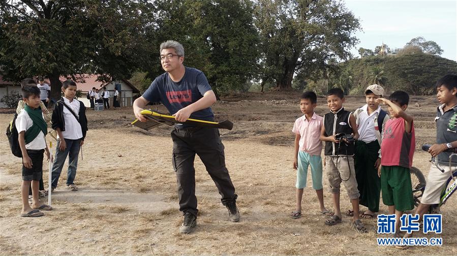 2017年1月27日,周小棣教授在缅甸妙乌古城遗址准备释放固定翼飞机,航测古城核心区地形。 新华社发(东南大学供图)
