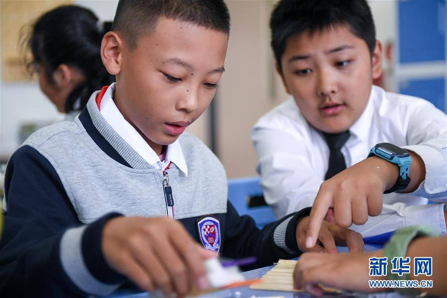 吉林大学附属中学力旺实验中学七年级学生在STEAM课堂上制作实验模型(9月21日摄)。 新华社发 (颜麟蕴 摄)