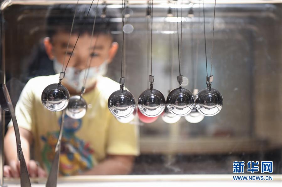 10月4日,一名小朋友在广东科学中心观看牛顿摆装置。 国庆长假期间,在广州市的广东科学中心,众多市民前来参观,近距离感受知识和科技的魅力。 新华社记者 邓华 摄