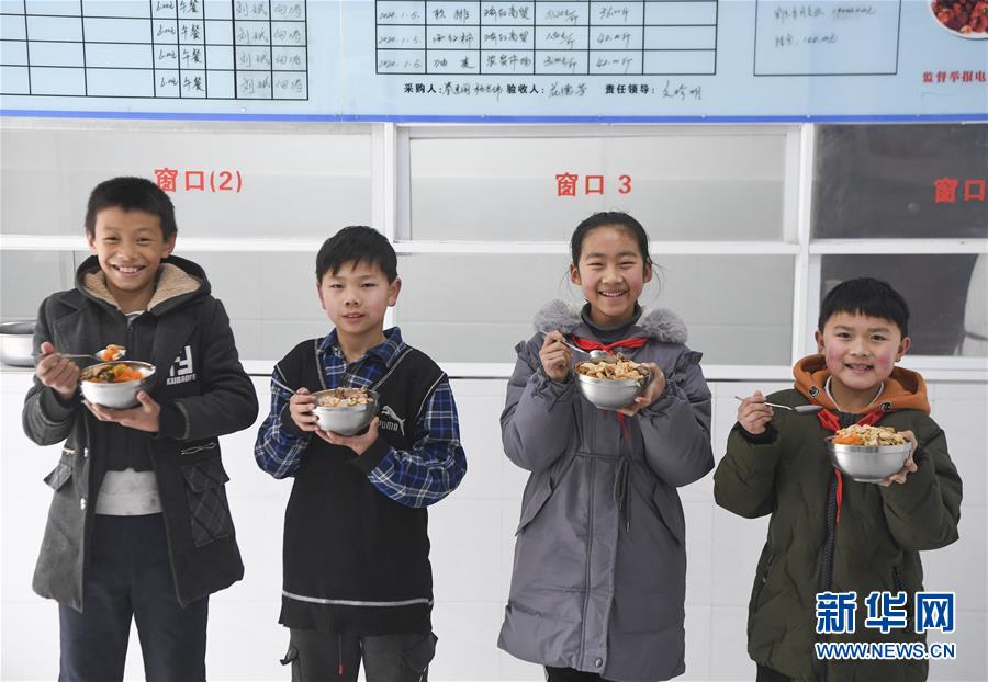 重庆市石柱土家族自治县中益乡小学学生在食堂展示刚打的饭菜(2020年1月10日摄)。新华社记者 王全超 摄