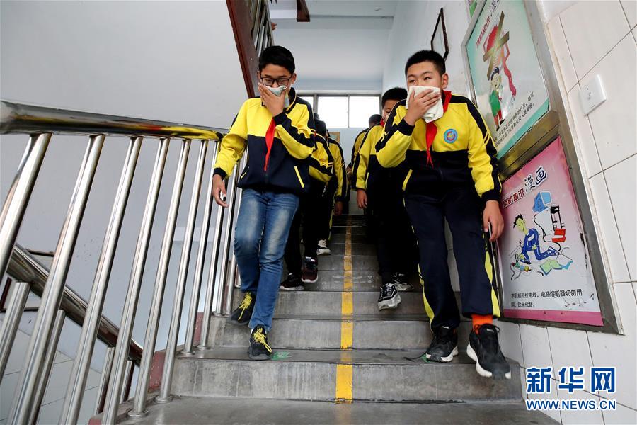 10月13日,山东省枣庄市鑫昌路小学学生在模拟火灾现场紧急疏散。 当日是国际减灾日,山东省枣庄市鑫昌路小学开展校园安全教育活动,向学生们传授地震、消防以及常态化疫情防控等方面的常识,增强学生们的应急避险与安全自救能力。 新华社发(孙中喆 摄)