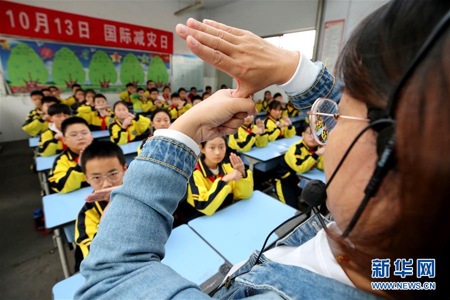 10月13日,山东省枣庄市鑫昌路小学的老师向学生讲解在疫情防控常态化之下如何正确洗手。 当日是国际减灾日,山东省枣庄市鑫昌路小学开展校园安全教育活动,向学生们传授地震、消防以及常态化疫情防控等方面的常识,增强学生们的应急避险与安全自救能力。 新华社发(孙中喆 摄)